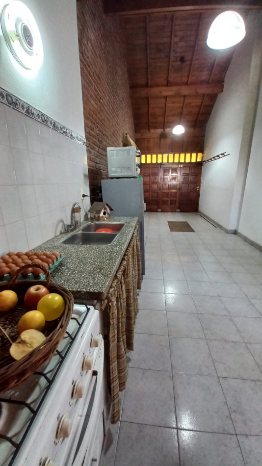 Gran garage para dos vehiculos, con quincho con cocina integrada, baño y parrilla con salida al parque. Lavadero.