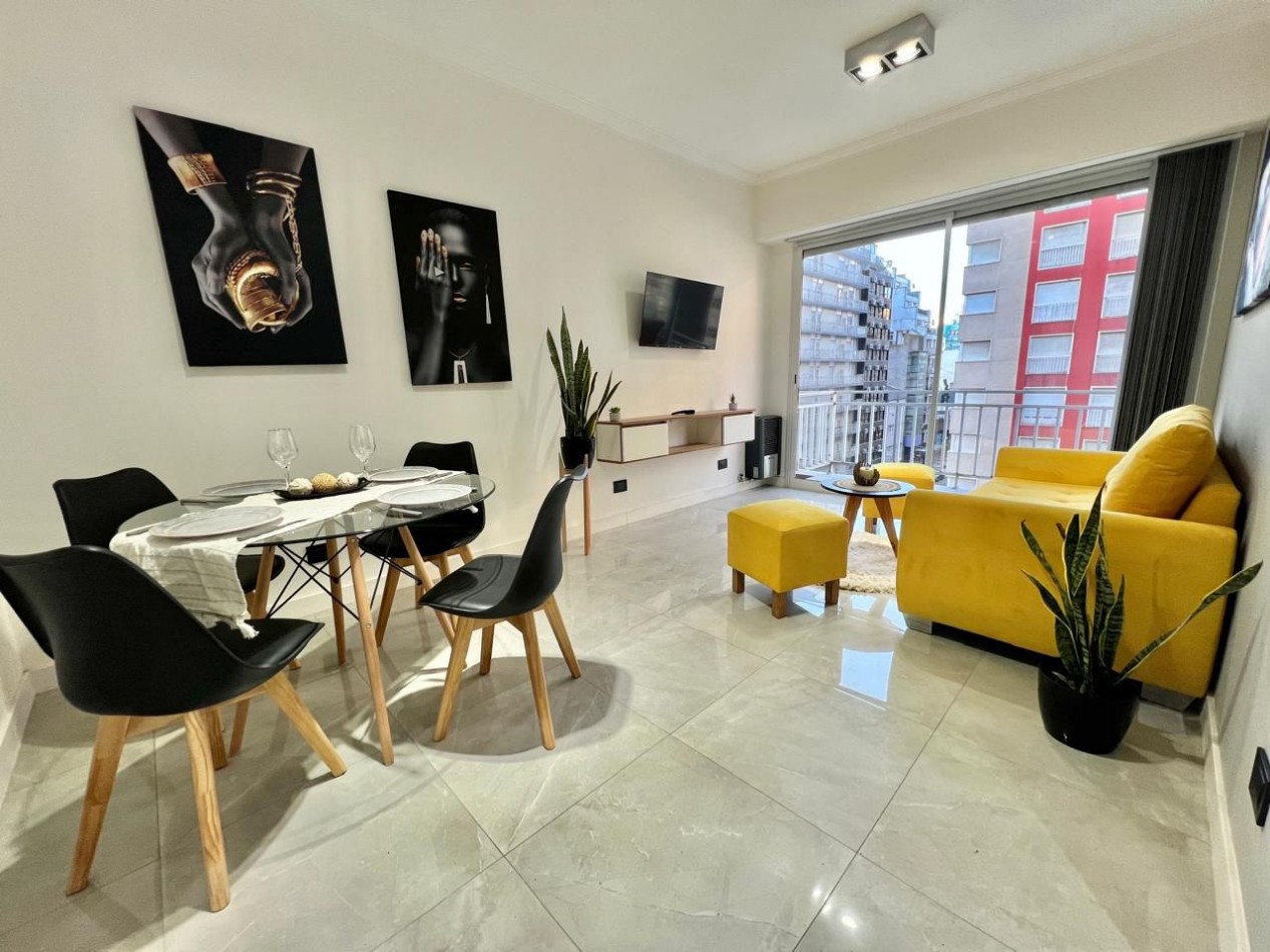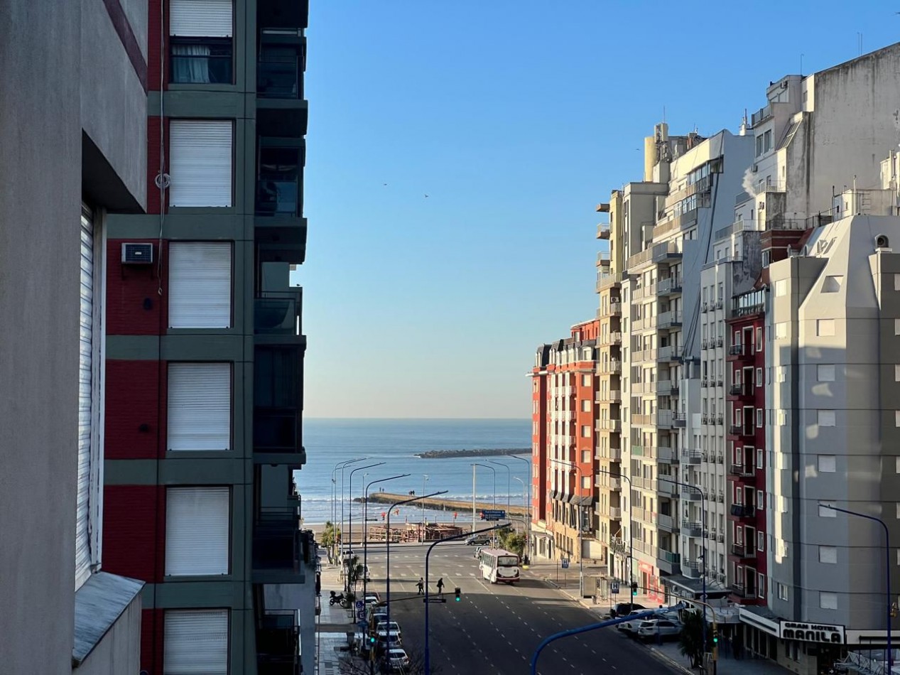 Living comedor a la calle con balcón saliente y vista parcial al mar, piso porcelanato. Conexión para parrilla a gas natural en balcón.