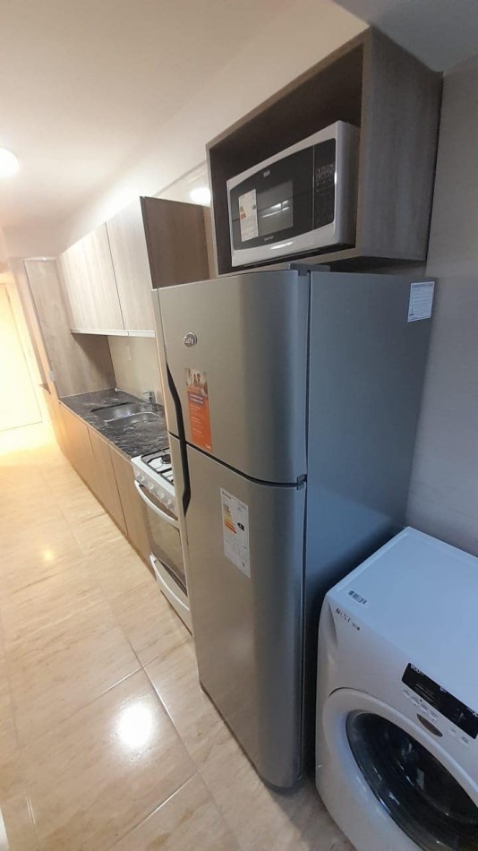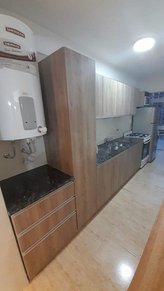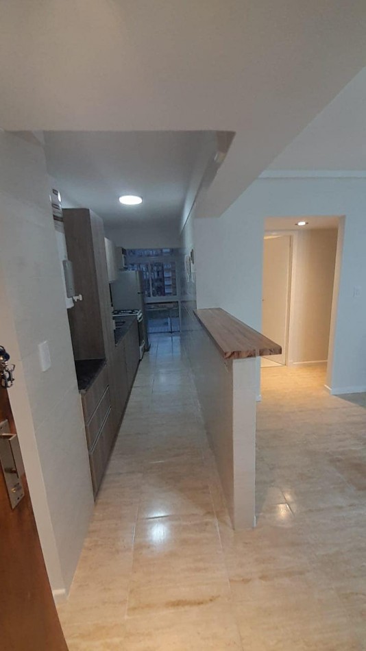 Cocina amplia con barra desarmadora y lavadero integrado. Con cocina, heladera, lavaropas y termotanque eléctrico.