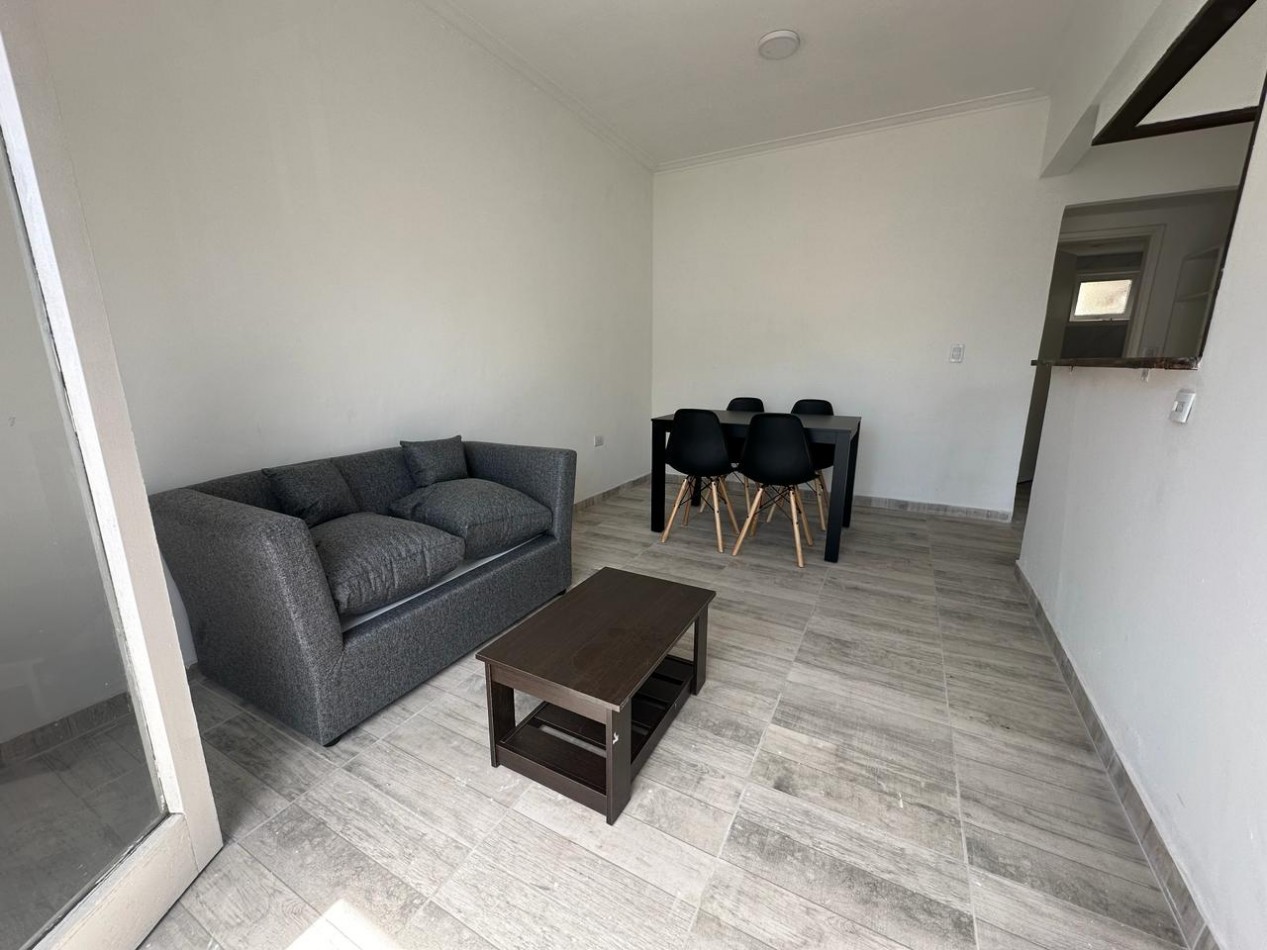 Living amueblado con mesa, 4 sillas, sillón doble y mesita ratona. Ventanal a la calle.