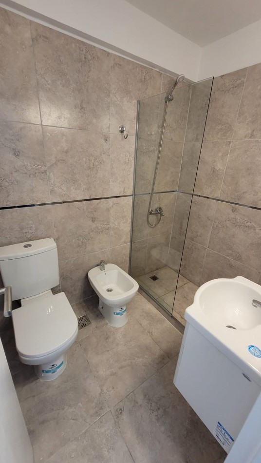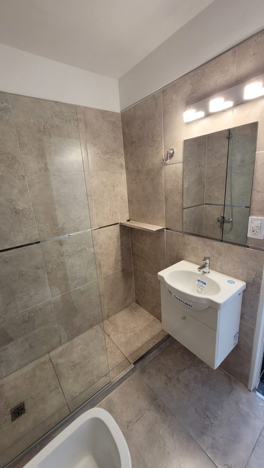 Baño revestido en porcelanato con pediluvio. Placard a medida.