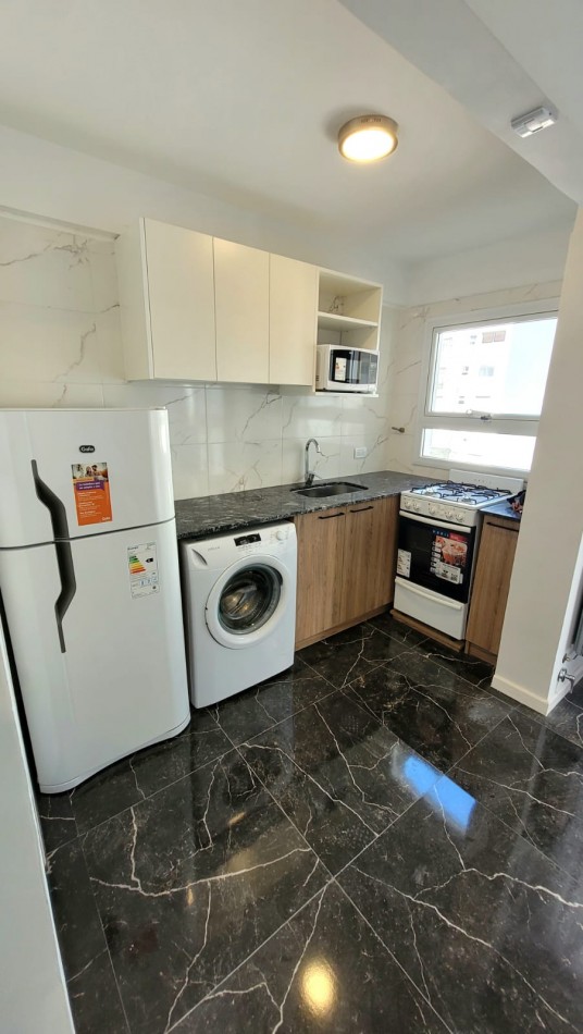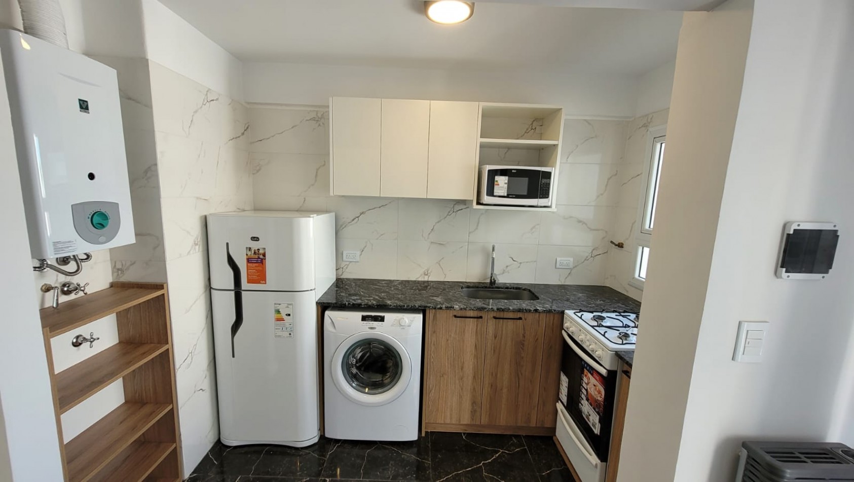 Cocina integrada con heladera, calefón, cocina, microondas y lavaropas.